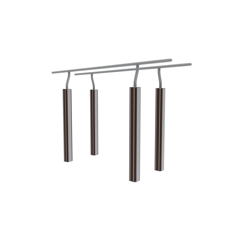 锻炼方法: a.分腿骑坐前进;b.杠端跳起越杠追逐跑;C.杠上外侧坐越两杠下;d.双手握杠跳起成直臂支撑,然后身体下至两肘成直角,再用力撑起成直臂支撑为1次。e.双手握杠跳起直臂支撑,双腿提起与上体成90度,然后返回原位为1次