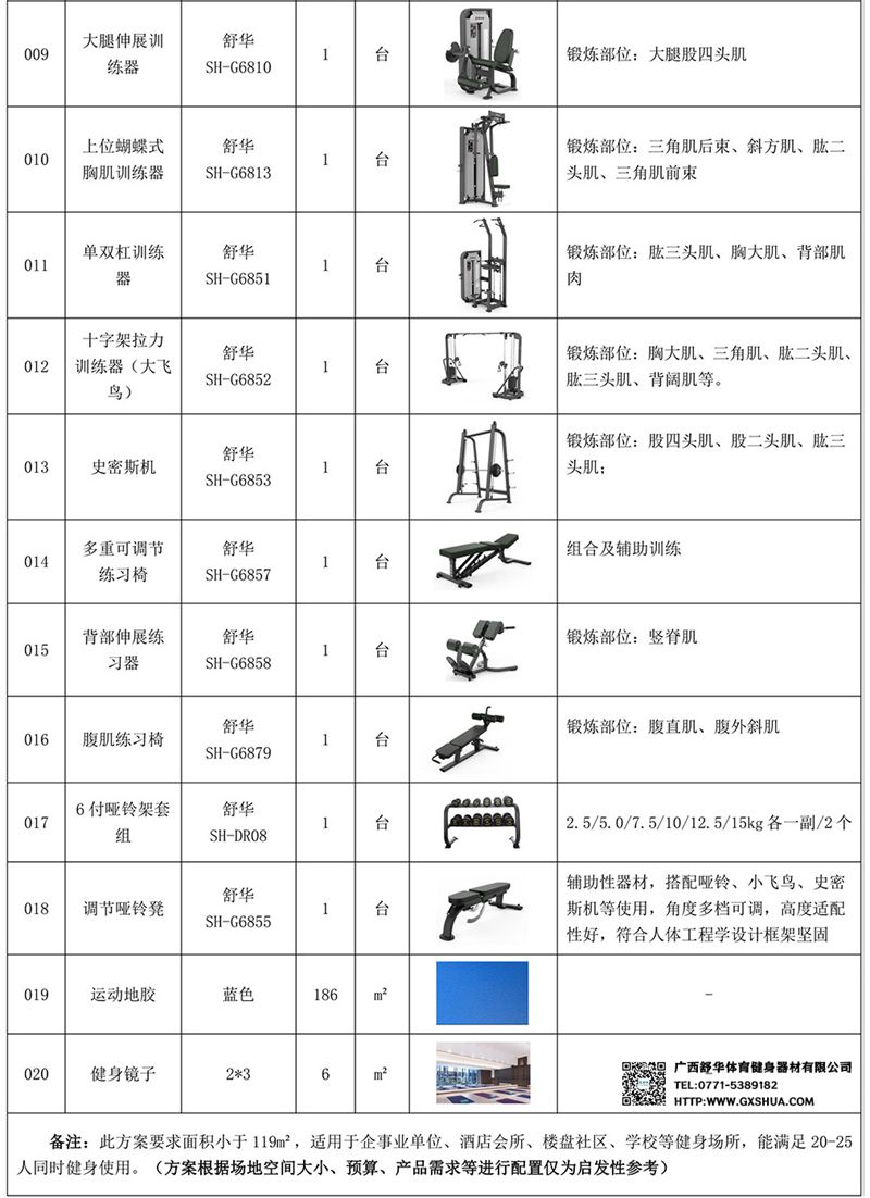 此方案要求面积小于119m²,适用于企事业单位、酒店会所、楼盘社区、学校等健身场所,能满足25-35人同时健身使用。(方案根据场地空间大小、预算、产品需求等进行配置仅为启发性参考)