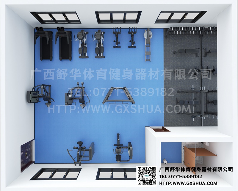 此方案要求面积小于90m²,适用于企事业单位、酒店会所、楼盘社区等健身场所,能满15-20人同时健身使用。(方案根据场地空间大小、预算、产品需求等进行配置仅为启发性参考)