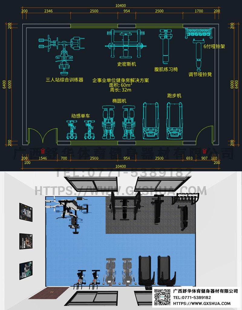 此方案要求面积小于60m²,适用于企事业单位、酒店会所、楼盘社区、工作室、等健身场所,能满10-15人同时健身使用。(方案根据场地空间大小、预算、产品需求等进行配置仅为启发性参考)