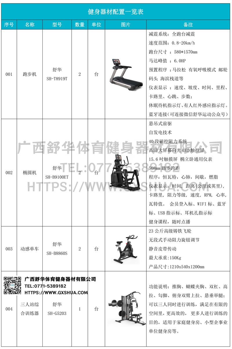 1.米兰V9跑步机SH-T8919T*2台-V9+采用全跑台减震设计,为跑者提供舒适的落脚地感和稳定的跑步支撑,良好的缓冲防护,降低膝关节受伤风险。商用大跑台,为跑者提供从容奔跑空间,180kg承载力,580*1570纯跑台面积,满足专业健身需求。V9+采用F级商用马达,6HP峰值马力,20km/h最高速度,提供源源不断的动力。V9+内置健身直播软件,每周提供直播课程,内含大量专业线上健身点播课程,可为健身房不同人群提供多样化健身课程服务。