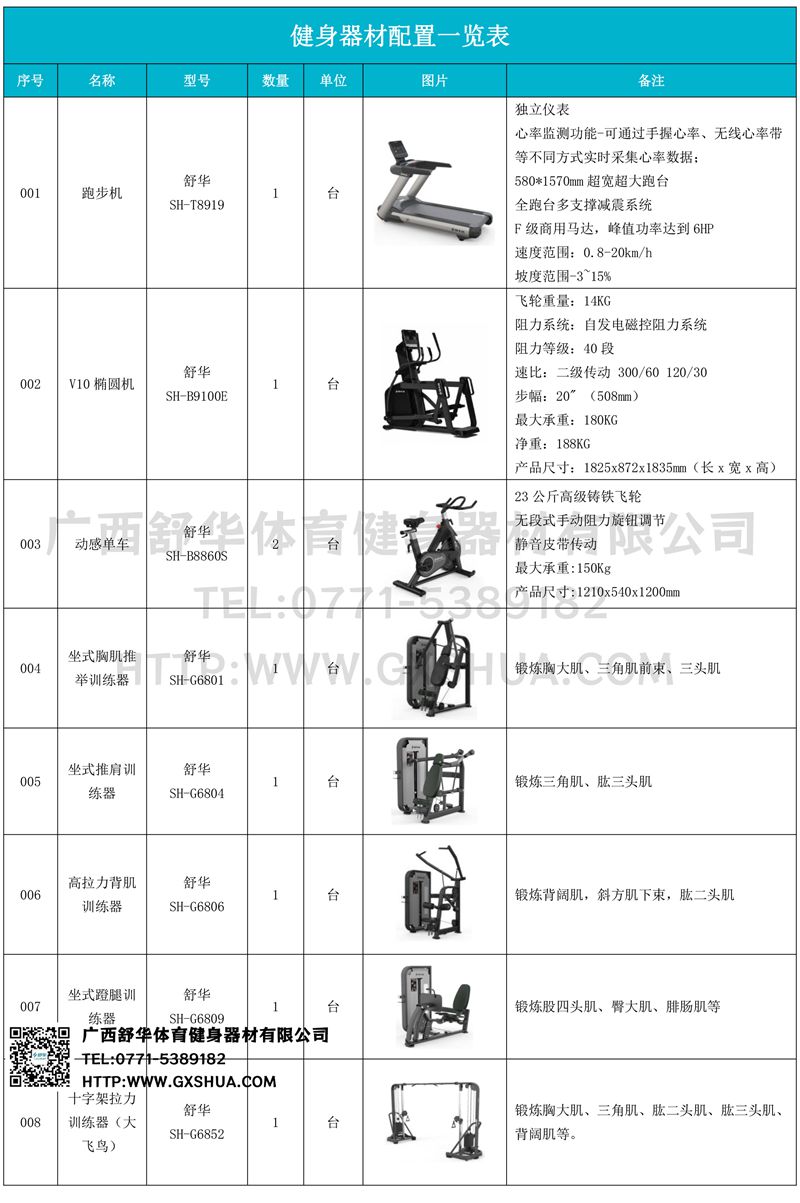 1.米兰V9跑步机SH-T8919*4台-580*1570mm超宽超大跑台-跑感舒适,跑台整体安全稳定;全跑台多支撑减震平台,保证跑台超强支撑力,达到180kg支撑,满足专业健身房需求。F级商用马达-超强马达,AC 3.0HP 交流,峰值功率达到6HP,F级商用品质。速度范围达到0.8-20km/h;V9跑步机可实现跑台扬升功能,坡度范围-3~15%,满足客户不同的锻炼需求。