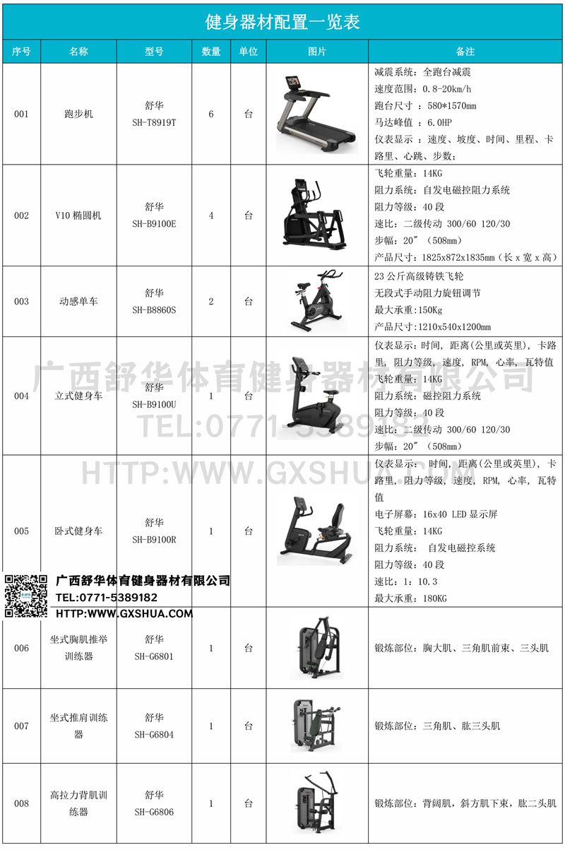 1.米兰V9跑步机SH-T8919T*6台-V9+采用全跑台减震设计,为跑者提供舒适的落脚地感和稳定的跑步支撑,良好的缓冲防护,降低膝关节受伤风险。商用大跑台,为跑者提供从容奔跑空间,180kg承载力,580*1570纯跑台面积,满足专业健身需求。V9+采用F级商用马达,6HP峰值马力,20km/h最高速度,提供源源不断的动力。V9+内置健身直播软件,每周提供直播课程,内含大量专业线上健身点播课程,可为健身房不同人群提供多样化健身课程服务。