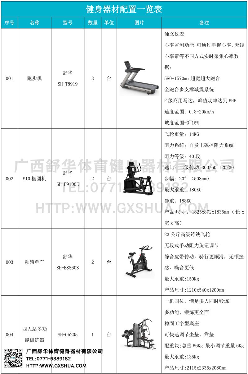 1.米兰V9跑步机SH-T8919*3台-独立仪表-简洁大气,全新外观设计,健康运动新选择;心率监测功能,可通过手握心率、无线心率带等不同方式实时采集心率数据;580*1570mm超宽超大跑台-跑感舒适,跑台整体安全稳定;全跑台多支撑减震平台,保证跑台超强支撑力,达到180kg支撑,满足专业健身房需求。F级商用马达-超强马达,AC 3.0HP 交流,峰值功率达到6HP,F级商用品质。速度范围达到0.8-20km/h;V9跑步机可实现跑台扬升功能,坡度范围-3~15%,满足不同的锻炼需求。
