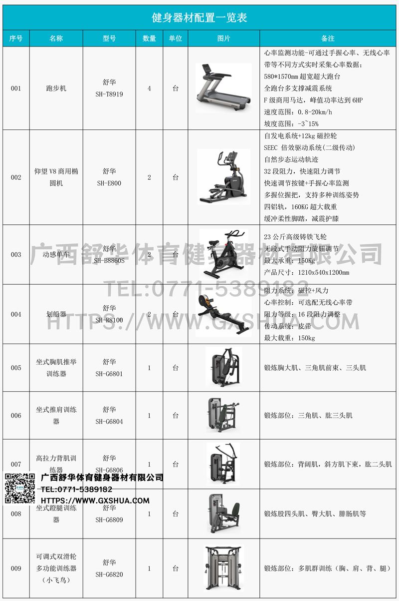 1.米兰V9跑步机SH-T8919*4台-580*1570mm超宽超大跑台,全跑台多支撑减震平台,保证跑台超强支撑力,达到180kg支撑,满足专业健身房需求。F级商用马达-超强马达,AC 3.0HP 交流,峰值功率达到6HP,F级商用品质。速度范围达到0.8-20km/h;V9跑步机可实现跑台扬升功能,坡度范围-3~15%,满足客户不同的锻炼需求。