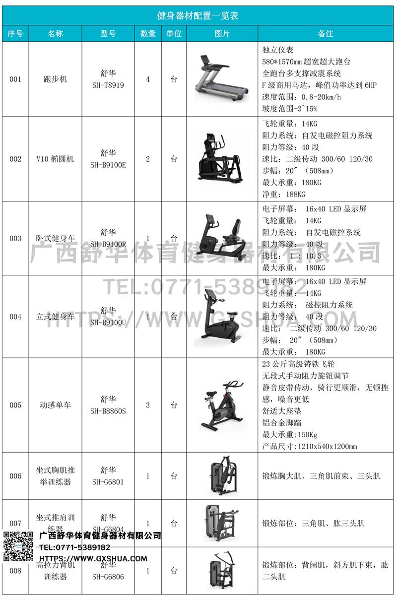 1.米兰V9跑步机SH-T8919*4台-独立仪表-简洁大气,全新外观设计,健康运动新选择;心率监测功能,可通过手握心率、无线心率带等不同方式实时采集心率数据;580*1570mm超宽超大跑台-跑感舒适,跑台整体安全稳定;全跑台多支撑减震平台,保证跑台超强支撑力,达到180kg支撑,满足专业健身房需求。F级商用马达-超强马达,AC 3.0HP 交流,峰值功率达到6HP,F级商用品质。速度范围达到0.8-20km/h;V9跑步机可实现跑台扬升功能,坡度范围-3~15%,满足客户不同的锻炼需求。