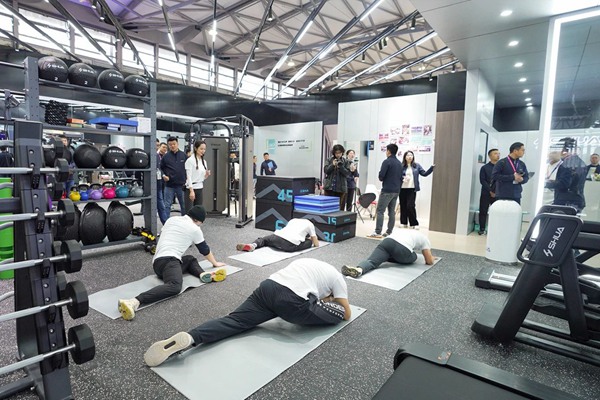 一进入米兰展位,参观者如踏入真实的健身门店中,经过前台和洽谈区,进入体测区,可以了解自己的身体状况,为接下来的健身计划提供科学依据。根据用户需求的差异性,以“体能-体脂-体型”进阶为参照,米兰健身会为用户规划出不同的课程类型,针对不同阶段的用户,匹配不同的授课内容及教练。展区还设有专业私教、特色团课以及设备体验区,参展观众可以在此亲身体验健身器材和优质健身课程,咨询健身教练,服务内容包含门店所有私教、小班课及器械使用指导,极具专业性和针对性。
