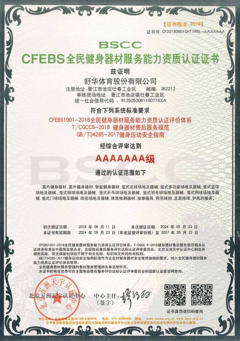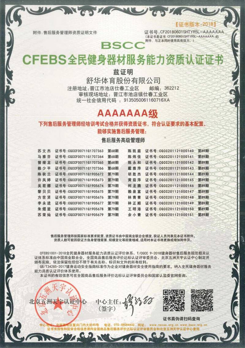 米兰以用户满意作为服务追求,凭借专业的技术能力及服务保障能力、有效的售后服务体系,获得“BSCC-CFEBS 全民健身器材服务能力资质认证证书 AAAAAAA 级”,部分员工经培训考试合格并获得“BSCC-CFEBS 全民健身器材服务能力资质认证证书-售后服务高级管理师(AAAAAA 级)。
